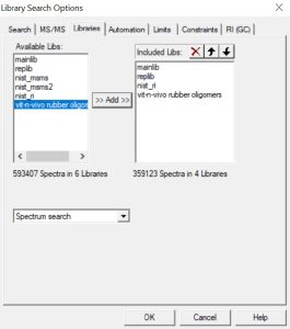 First, download the compressed Vit-n-Vivo’s mass spectral library of rubber oligomers and extract it into the NIST14\MSSEARCH\ folder. The library is in NIST format and contains mass spectra of seven rubber oligomers:
